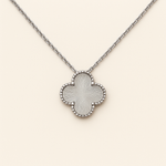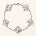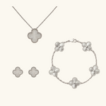 Fascinerende Smykkesett med halskjede, armbånd og øredobber forener tidløs klasse med et moderne preg. Den ikoniske sølvkløver, innrammet i raffinerte gull, utstråler subtil luksus – perfekt for daglig bruk eller som et stilfullt supplement til en elegant middag.
