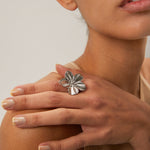 Oppdag Alina Sølv Petal Ring, et smykke som feirer naturens kunstneriske uttrykk. Laget av etisk fremstilt rustfritt stål, fanger denne ringen den tidløse skjønnheten til en blomstrende blomst med sin organiske, realistiske petalform.